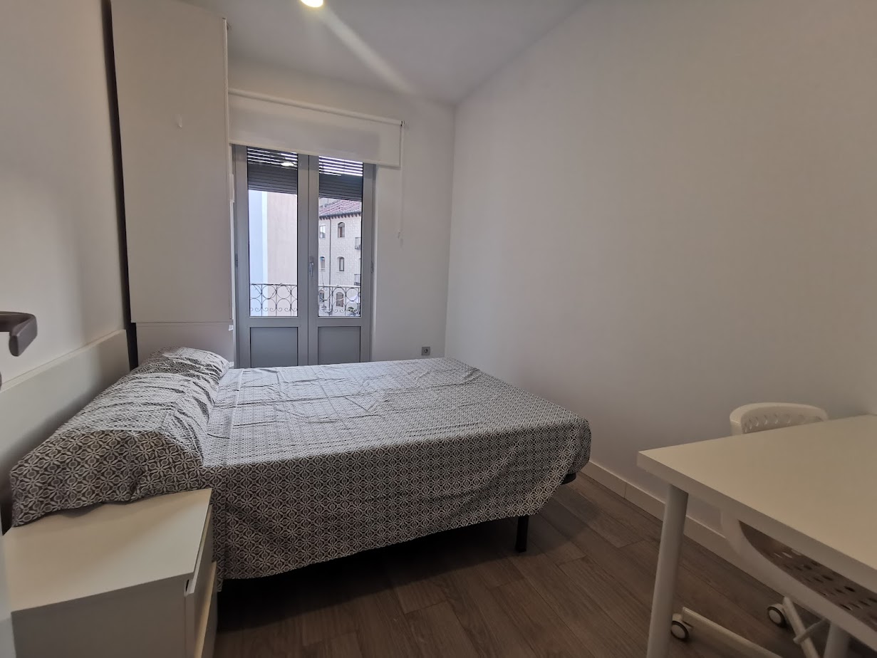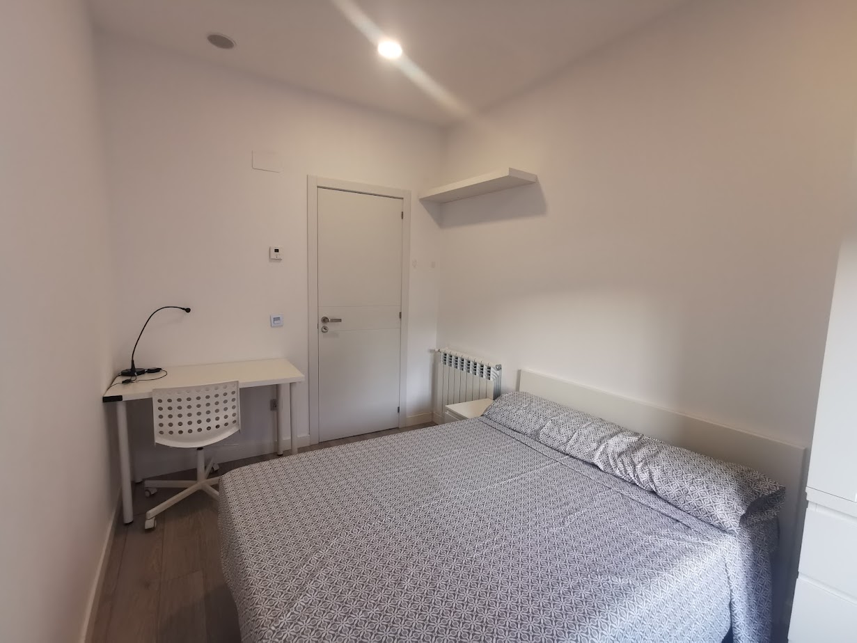 Very comfortable room of approximately 12m2 on average, with private bathroom. Includes a marvelous double bed with closet, desk, chair, and shelf.